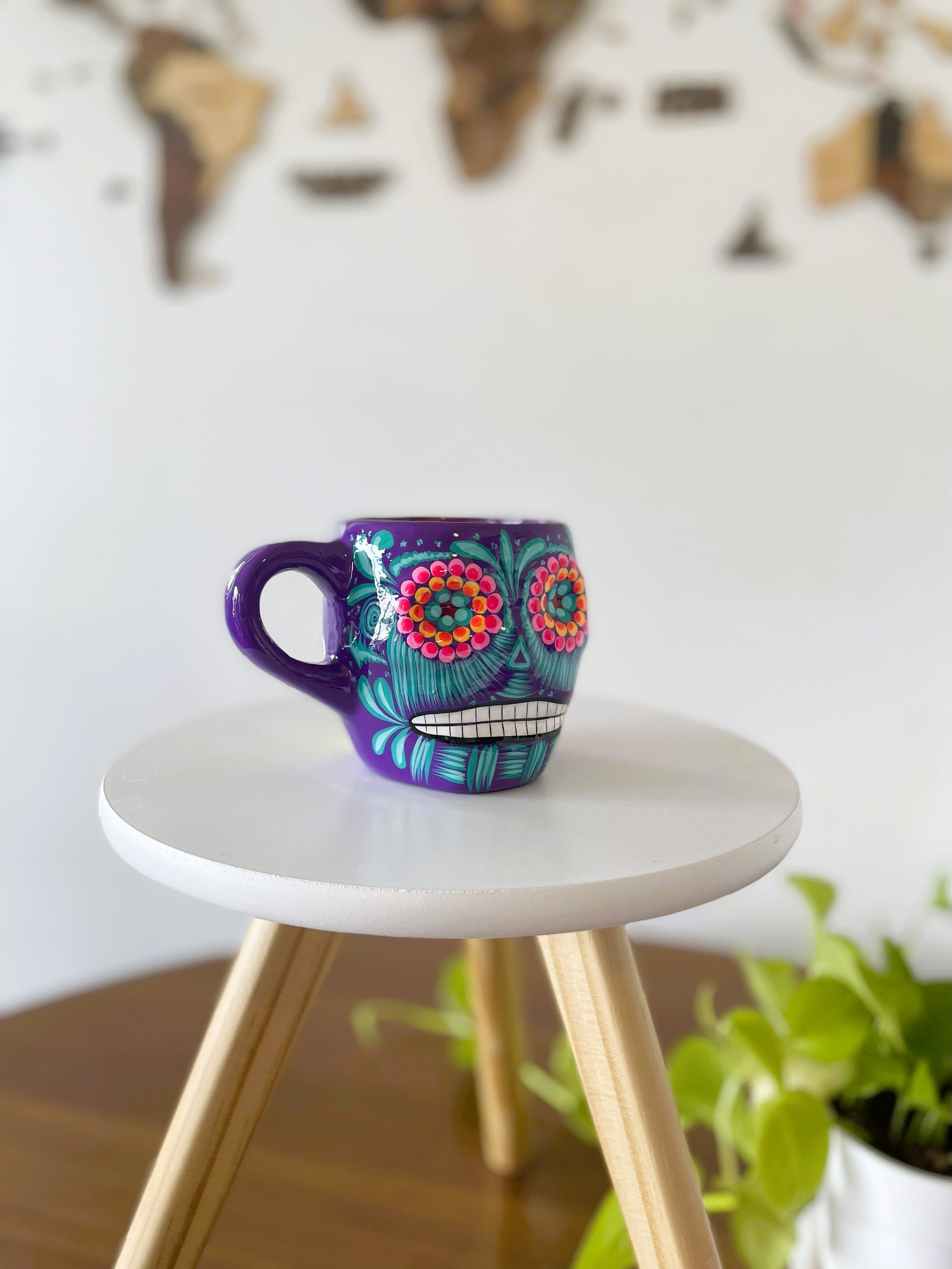 陶器のカラベラのマグカップは、メキシコの伝統に根ざしたかつユニークな手書きデザインが魅力です。豊かな色彩と個性的な模様が施されており、飲み物を楽しむひとときを華やかに彩ります。家庭での使用はもちろん、友人や大切な方へのギフトにも最適なアイテムです。