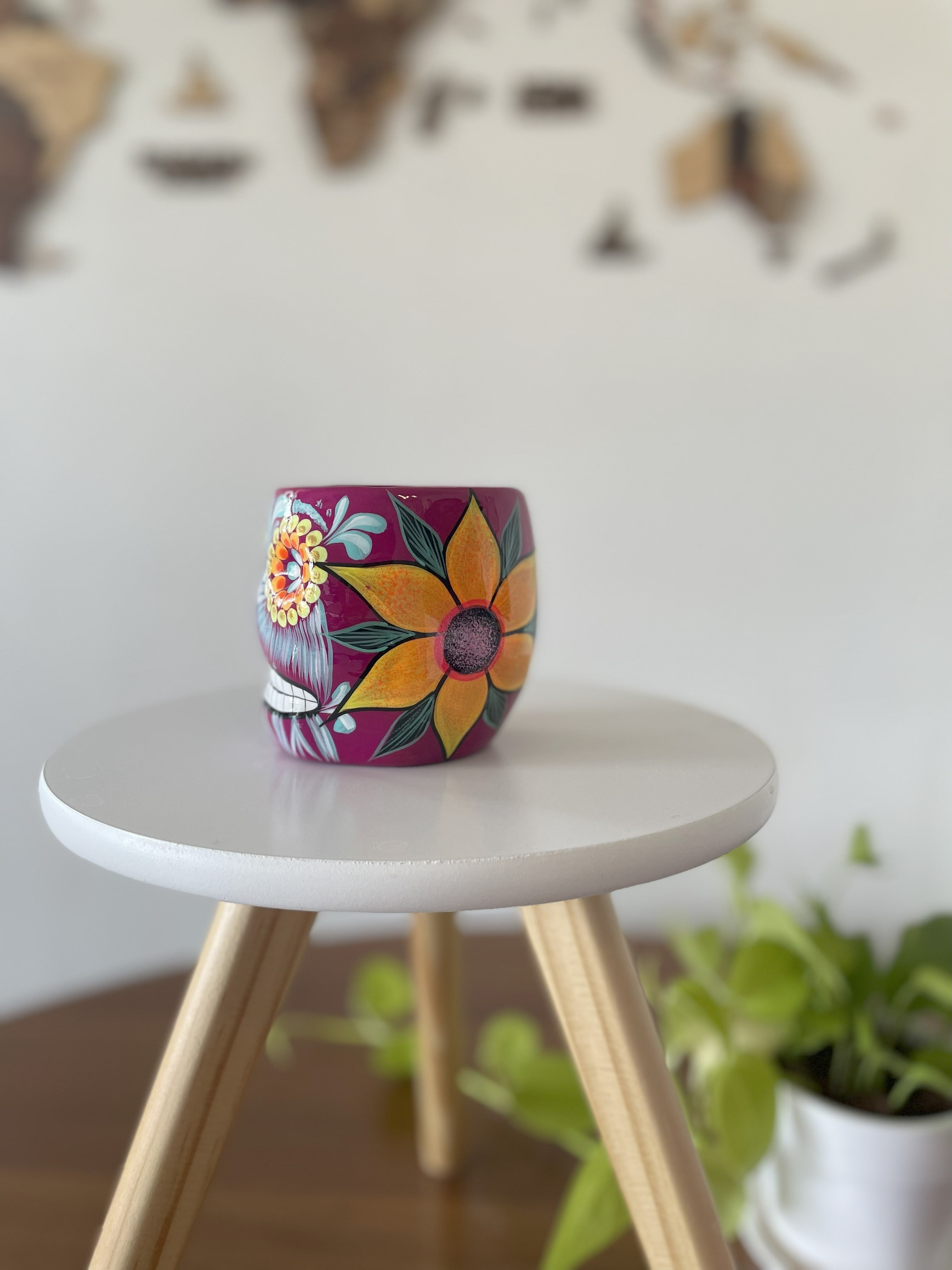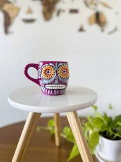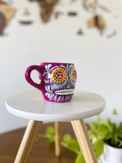 陶器のカラベラのマグカップは、メキシコの伝統に根ざしたかつユニークな手書きデザインが魅力です。豊かな色彩と個性的な模様が施されており、飲み物を楽しむひとときを華やかに彩ります。家庭での使用はもちろん、友人や大切な方へのギフトにも最適なアイテムです。