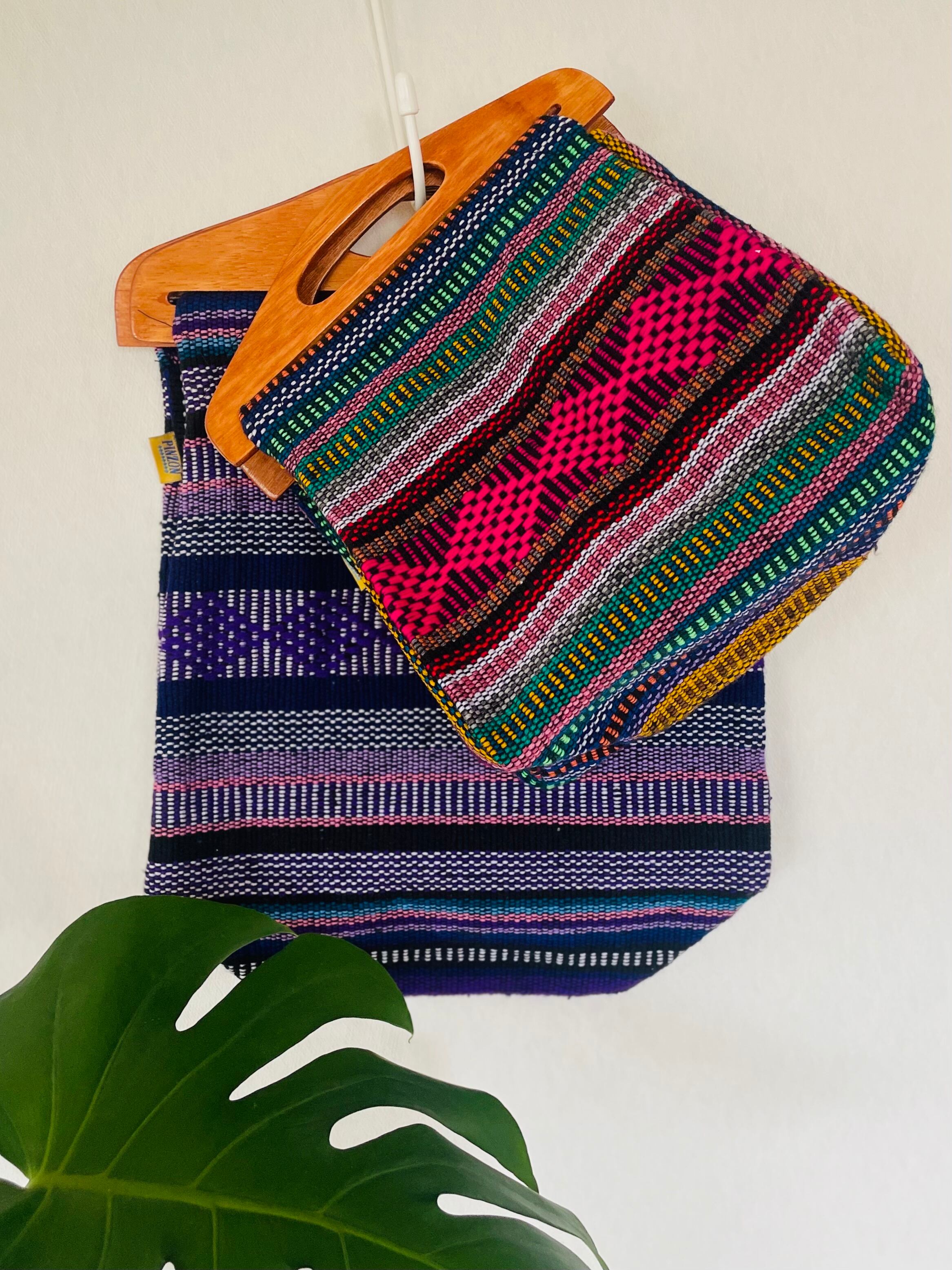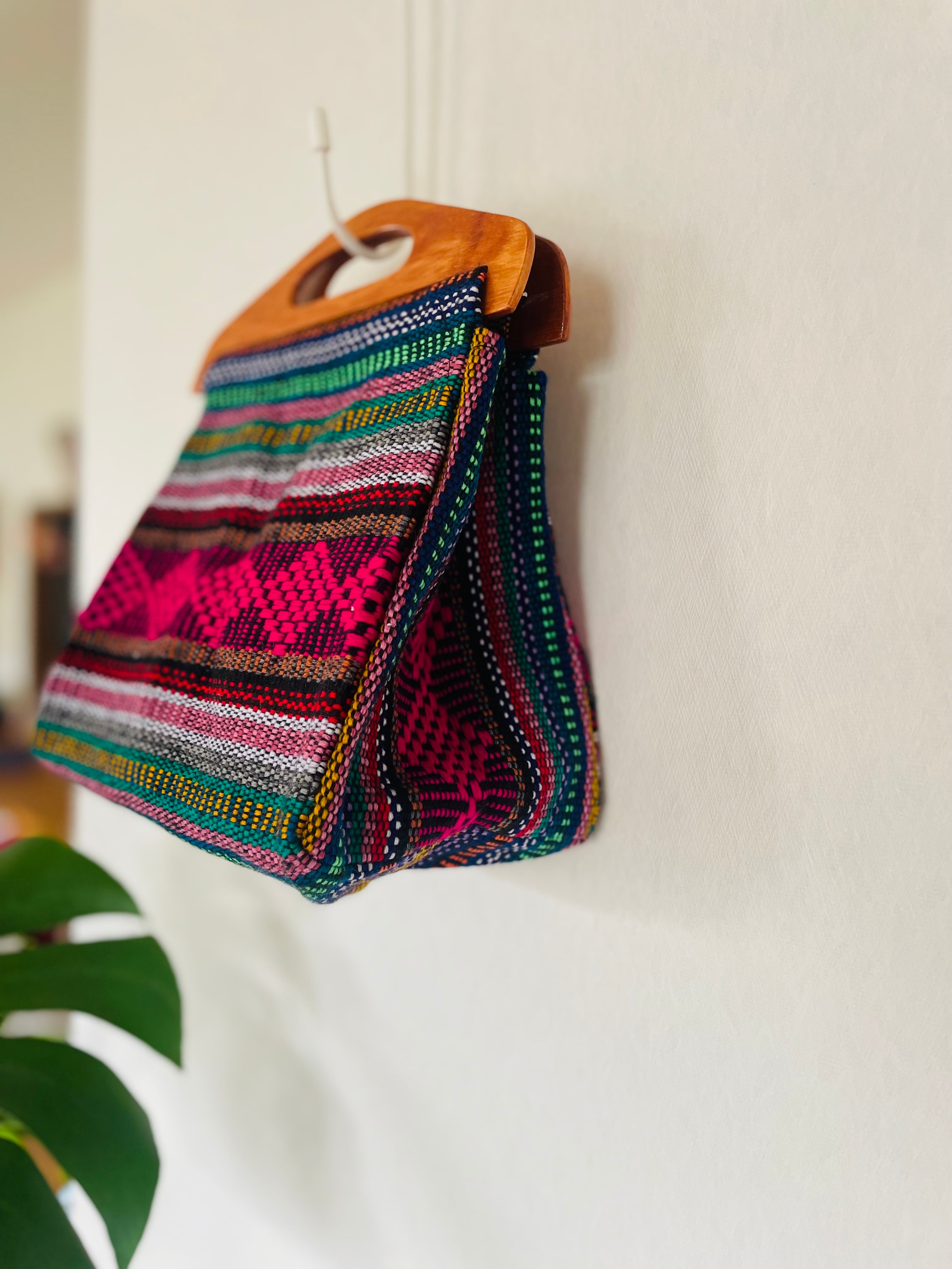 メキシコ布のクラッチバッグS(ピンク)は、メキシコらしい鮮やかな色合いとデザインで作られた、おしゃれで可愛らしいアイテムです。この小ぶりなサイズのバッグは、特別なお出かけや日常使いにもぴったり。持ち手には温もりを感じられる木製を使用しており、持ちやすさも抜群です。ちょっとしたアクセントを加えるのに最適な存在です!